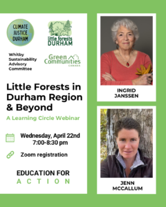 Little Forests Durham will be celebrating Earth Day 2026 with the Whitby Sustainability Advisory Committee and Green Communities Canada by participating in the next Climate Justice Durham‘s Learning Circle webinar.